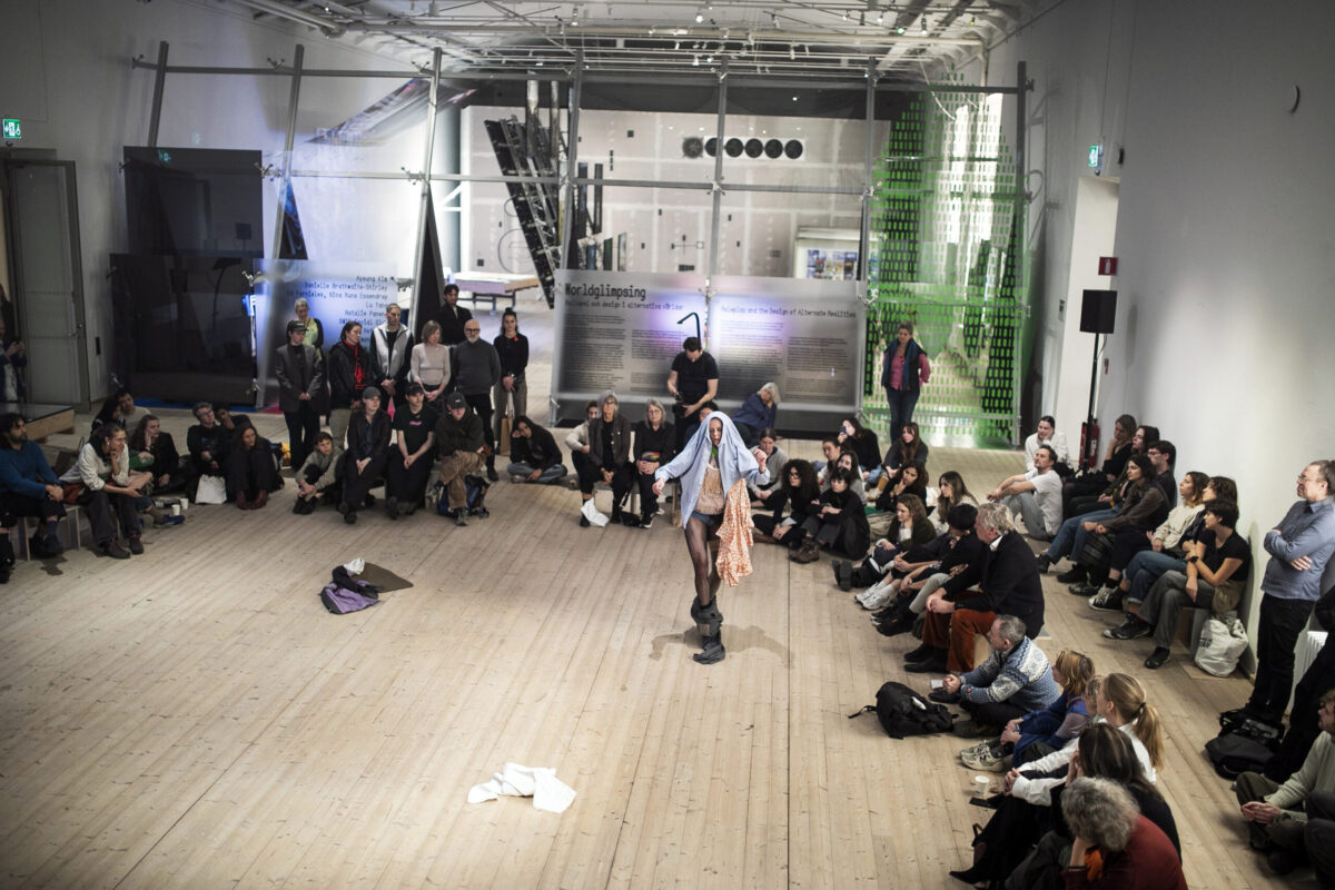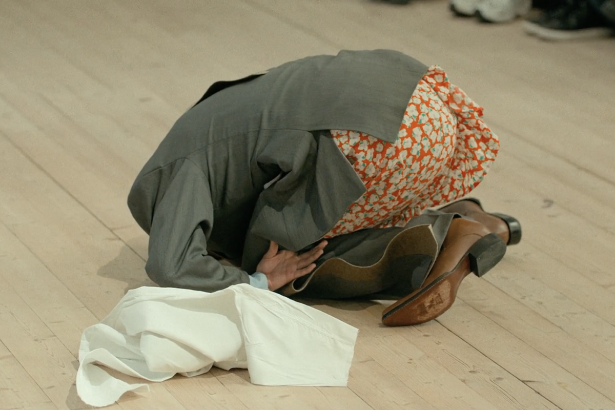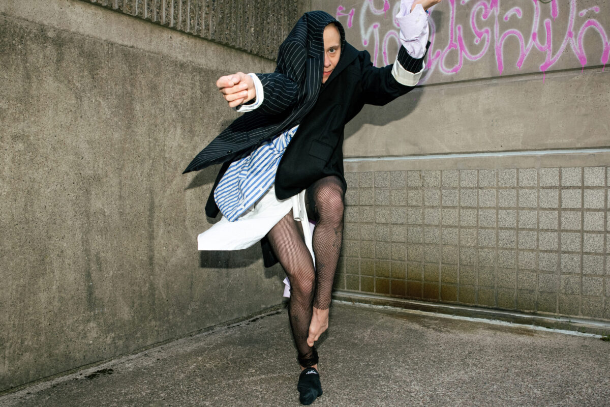 Play Overlay is a dance for the unnameable self that, in everyday life, is translated into roles through the act of coding ourselves with clothing. It is a solo performance by Teo Ala-Ruona and the working group, asking how our everyday roles can be shaped, slip away, and be shed?